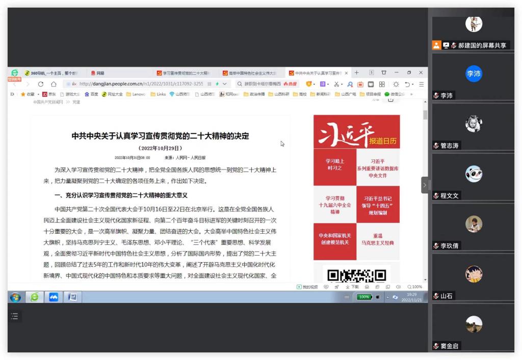 据校党委《关于深入学习宣传贯彻党的二十大精神的实施方案》和院党委的学习工作安排,11月21日,编导播音教工党支部组织全体党员专题学习研讨党的二十大精神。支部书记郝建国主持会议。